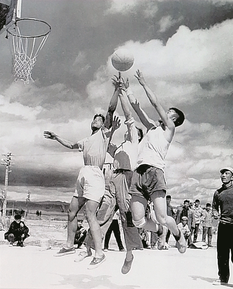 1961年5月1日,农四师高尔基农场(现四师七十三团)举办职工篮球比赛。图为双方球员激烈争抢的场景。李念臣 提供