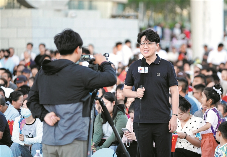十师融媒体中心记者胥强(右)在文化活动现场出境(摄于7月12日)。 李正虎 摄