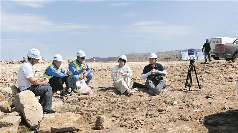 在位于九师一七〇团克孜尔山区的额敏县国信风力发电有限公司200兆瓦风力发电项目施工现场,九师融媒体中心记者苟汇敏(左四)、官航(左五)正在采访(摄于8月24日)。王成营 摄