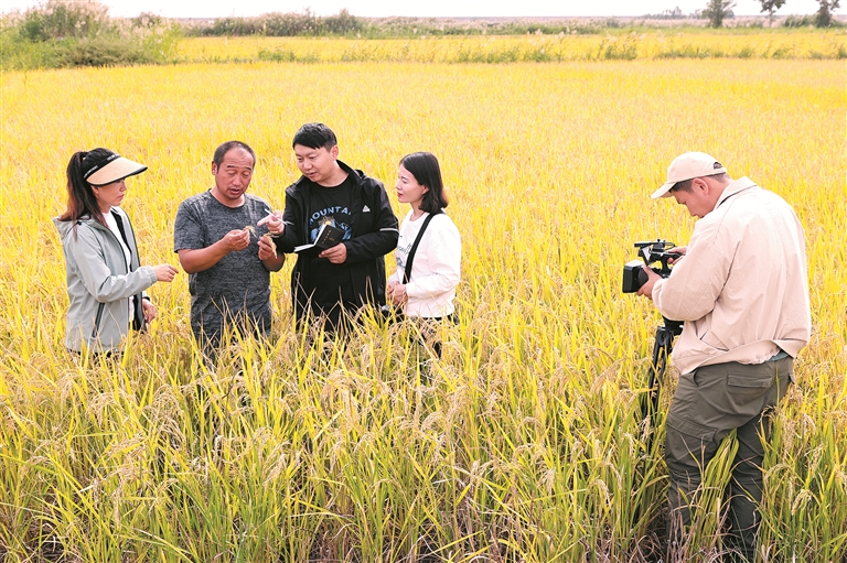 六师芳草湖农场三十一连水稻田里,六师融媒体中心记者党慧萍(左一)、李华北(左三)、张新慧(左四)、芦轩辕(右一)在采访三十一连党支部书记、连管会指导员黄勇(左二)(摄于9月28日)。杜仪 摄