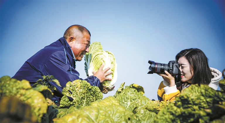 五师九○团文体广电站记者白雪(右)在该团九连采访职工农产品生产销售情况(摄于11月1日)。秦桂连 摄