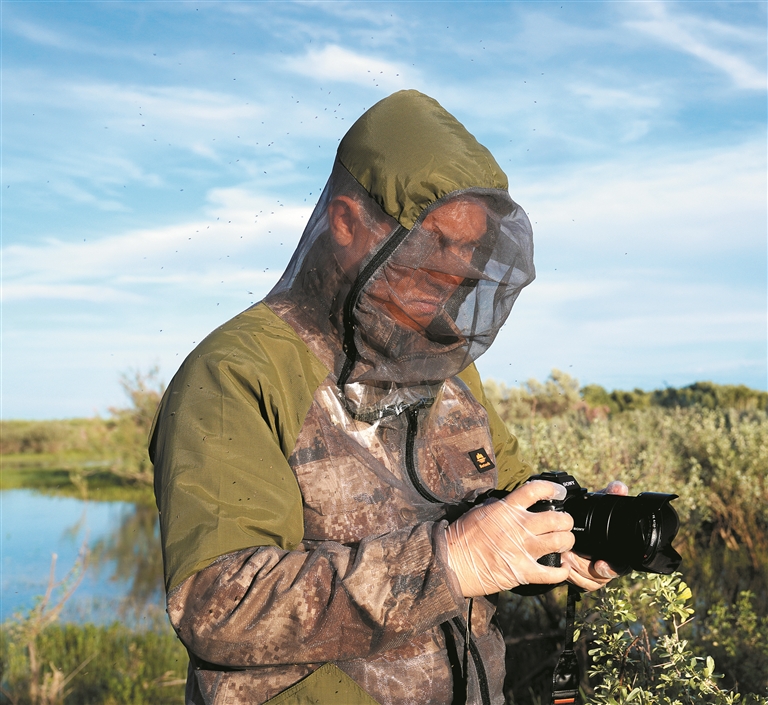 兵团日报全媒体记者陈洋在十师一八五团拍摄护边员坚守蚊区巡逻的视频素材(摄于6月12日)。 李正虎 摄
