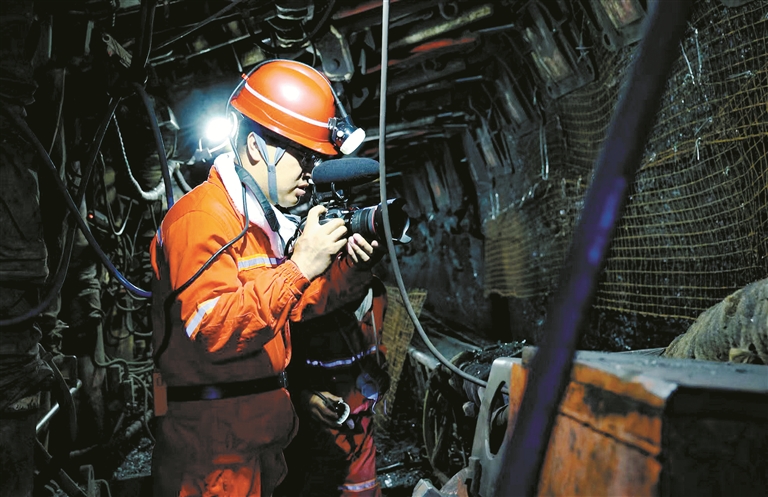 二师融媒体中心记者李嘉成在矿井内采访(摄于10月26日)。魏承亿 摄