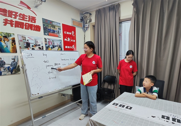 图① 郑州大学2022级本科生陈艳影(左一)参加志愿活动,教社区儿童学英语。 受访者供图