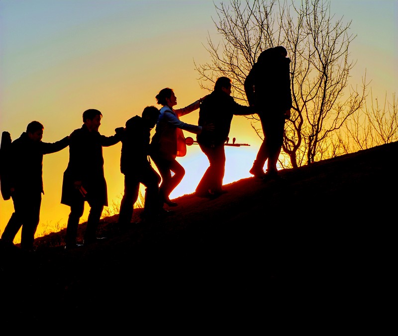 这两天,一条美女研究生与左权盲艺人走山高唱 《桃花红 杏花白》的视频,在抖音上小火了一把。视频中,中国音乐学院声乐歌剧系研究生冯丽媛与左权盲人宣传队的盲艺人们手搭肩膀,行走在太行山间,夕阳把这一队“奇特却无比和谐”的组合映射成剪纸般的景象,深深烙印在围观村民的心坎儿上。