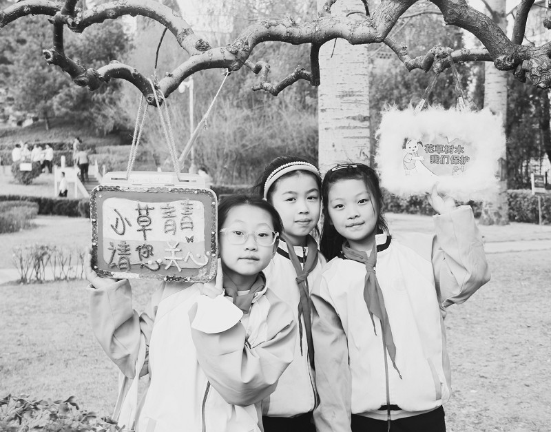 在队员们的巧思妙想下,一块小木板、一张硬纸板,摇身变成小动物、小花、小蘑菇等各种可爱别致的造型;“小脚不乱跑,小草微微笑”“少折一枝花,多闻一缕香”“细心呵护环境,共创美好家园”“手上留情花自香,脚下留情草如茵”……标牌上的每个字词、每句话语、每幅小插图,都表达着队员们热爱大自然的真心诚意。当队员们将这些充满童趣的宣传标语牌悬挂在学校旁边小公园的树枝上、插立在花坛草坪间时,收获了游客们的一片赞扬之声。
