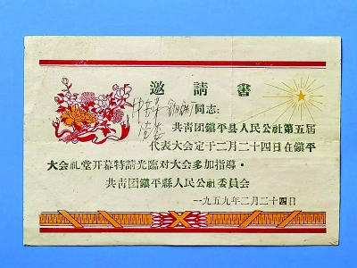 这份尺寸不算大的邀请书,“颜值”较高,是1959年2月24日由“共青团(河南省南阳市)镇平县人民公社委员会”所填发,是邀请参加团代会开幕式嘉宾的礼仪性信函。其实,这就是一份我们非常熟悉的请柬,或者说是一份请帖,它们尽管名称不同,但性质却相同,均为邀请相关人员出席团代会的正式函件。