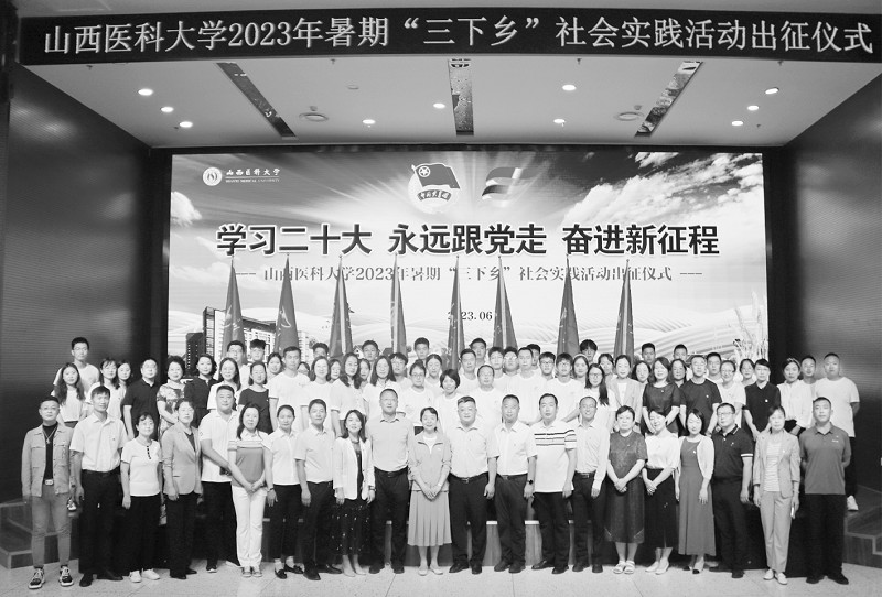 近日,山西医科大学在中都校区举行了2023年暑期“三下乡”社会实践活动出征仪式。学校相关职能部门和部分院系负责人,各院系党组织分管学生工作的副书记、分团委书记,校团委工作人员,社会实践队指导教师和全体队员参加了出征仪式。