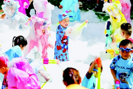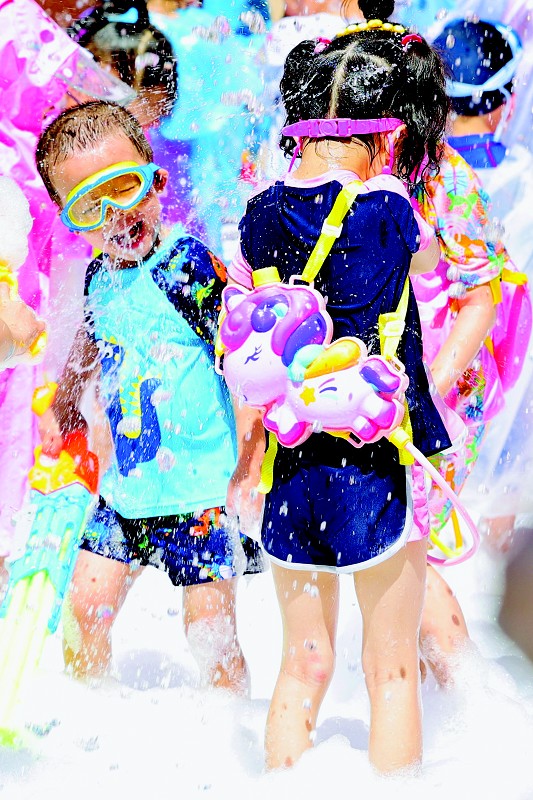7月11日,全国开启入伏模式。应对三伏天,人们各想各招防暑纳凉,萌娃更是表示不“伏”。太原市一家幼儿园的宝宝们穿上雨披,在铺满水泡的场地里戏水游玩,尽情地释放天性。随着气温连续攀升,有关部门提示广大市民在日常生活工作中注意防暑降温,老弱病幼人群午后高温时段尽量避免户外活动。本报记者 胡远嘉 摄影报道