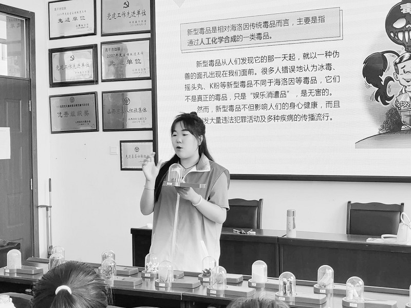 课堂上,志愿者借助毒品模具,使用通俗易懂的语言向孩子们介绍什么是毒品、毒品的种类和危害,通过展示仿真毒品模型,组织孩子们“零距离”了解各类毒品的真实形状,进一步增强孩子们对毒品的防范意识,使防毒意识深入童心。在互动交流环节,孩子们踊跃抢答、分享收获,将热烈的氛围推向高潮。