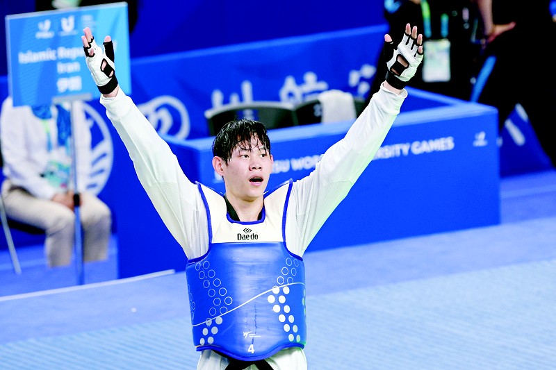 8月3日晚,在大运会跆拳道男子87公斤级以下的比赛中,中北大学学生孟明宽以2∶1逆转险胜伊朗选手,成功夺冠,为中国代表团拿下一枚金牌。