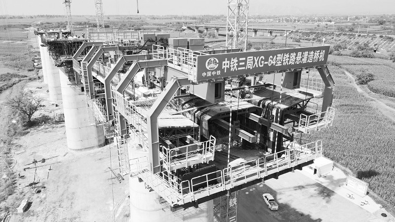 为保证桥梁架设安全高效推进,中铁三局联合中铁五院研制了这台XG-64型上承式结构悬灌造桥机,并首次在雄忻高铁山西段投入使用。该造桥机由移动支架、模板、电控液压、安全防护、信息化、智能控制等多个系统组成,可适用于不同跨度、不同断面的连续梁施工,具有轻量化、智慧化等特点。