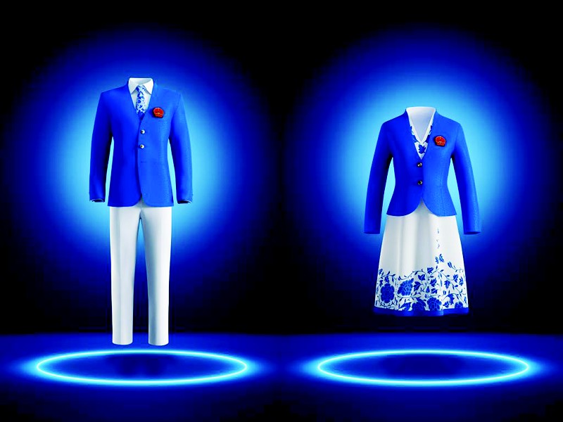 该礼服由九牧王打造,主色调为白与蓝;锁甲纹环环相扣,暗示体育的竞技属性以及团结、坚韧的特点;牡丹与藤蔓交织,寓意蓬勃的生命力;颈部半立领设计则彰显中国服饰文化的魅力。