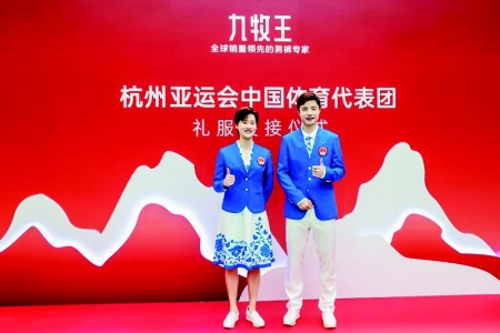 杭州亚运会中国体育代表团礼服交接仪式15日在北京举行,礼服“星耀”发布,中国羽毛球运动员陈雨菲、石宇奇试穿后都表示“很舒服”。