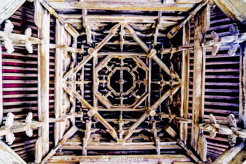 从戏台内部观看,顶部藻井全为木质结构,顶部看上去有点像八卦形状,上边两层全为从大到小的八角形,到了最下一层又巧妙地回归到四方四正的四边形,整座戏台没有使用一根钉子,全部由木材榫卯结合而成。据村里的老人讲,最早时戏台盖瓦损坏严重,人站到戏台中间,甚至能透过藻井看到天空,看似走风漏气,但是下雨时却是一滴雨都滴不进来,古代建造工艺的神奇可见一斑。
