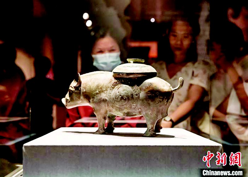 展厅中,一件“萌萌哒”的动物器型展品十分吸引人。这是2000年晋侯墓地113号墓出土的猪尊。这件猪尊猪体硕壮,四足平踏,吻部突出,獠牙外露,尾巴上卷。猪背上有盖,盖上有圈形捉手,盖面饰云雷纹。