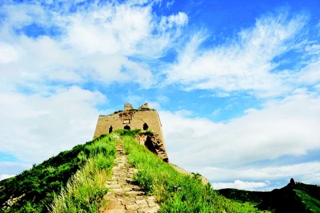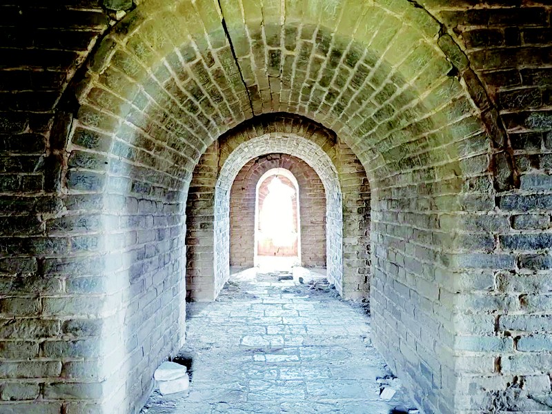 靠白草口一段,原垛口、女墙筑于石山上,如今已经没有土墙,唯有砖垛口巍然矗立于奇岩陡峰之巅,十分雄险壮观。暗门内侧可以屯兵,外侧就是冲锋的地段。长城顶部三层城砖铺面,上面可以骑马。长城附近建有烽火台、兵营暖屋,只是如今已被毁。