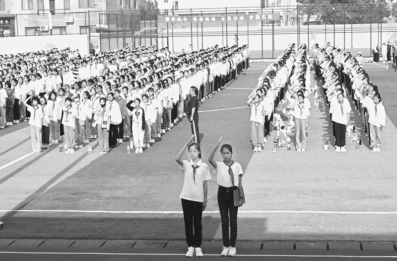 “我是中国少年先锋队队员,我热爱中国共产党,热爱祖国,热爱人民……深刻认识到作为一名光荣的少先队员肩上的使命和责任,不忘初心,继续前行。”操场上,近千名初一年级新生齐声宣誓。
