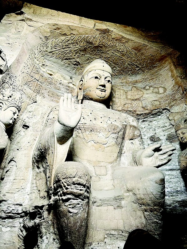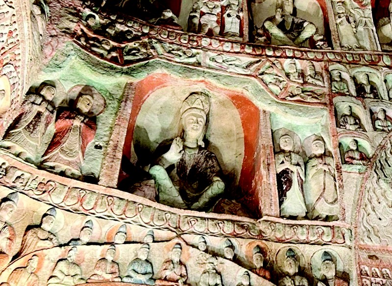 游览石窟时,不免有游人对造像身上的孔洞产生疑惑。真实原因是,在清朝曾有过多次修葺。维修的工匠先在造像上打孔,然后在小孔中插入木楔,并缠上麻绳,之后在孔口覆土并进行彩绘。这种方法虽然对原物有些许破坏,但从长远来看,不仅能延缓佛像的风化进程,还能起到很好的固定作用。只不过到了清朝后期,由于帝国主义的侵略,修缮工作渐渐荒废,进而停止。时间一长,覆在孔口上的泥土脱落,插在孔洞中的木楔也渐而腐烂、消失,只留下这些小孔,让后来者感到无限的莫名和困惑。