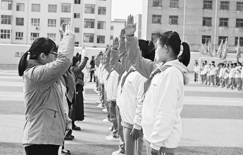 随着铿锵的出旗曲响起,少先队旗手和护旗手迈着整齐有力的步伐走来,全体少先队员行队礼,神情庄严而认真,唱响心中的那首中国少年先锋队队歌。该校团委书记申宏峰宣布初一年级中队成立决定,大队辅导员姚瑶宣布中队辅导员和中队长名单。与会领导为中队授旗,并为中队长佩戴标识,带领大家重温入队誓词。初一年级379班少先队员陶一一表示,今后将读书明理、立德修身,努力成为有志向有抱负、有道德有品行、有知识有本领、有自信有担当的新时代好队员。