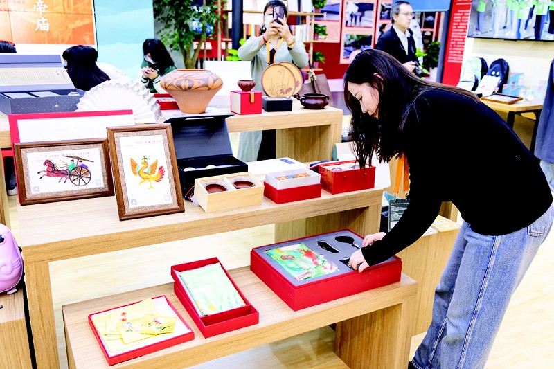 在山西省文物局的展区内,一排书架前驻足了许多游客。