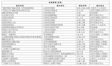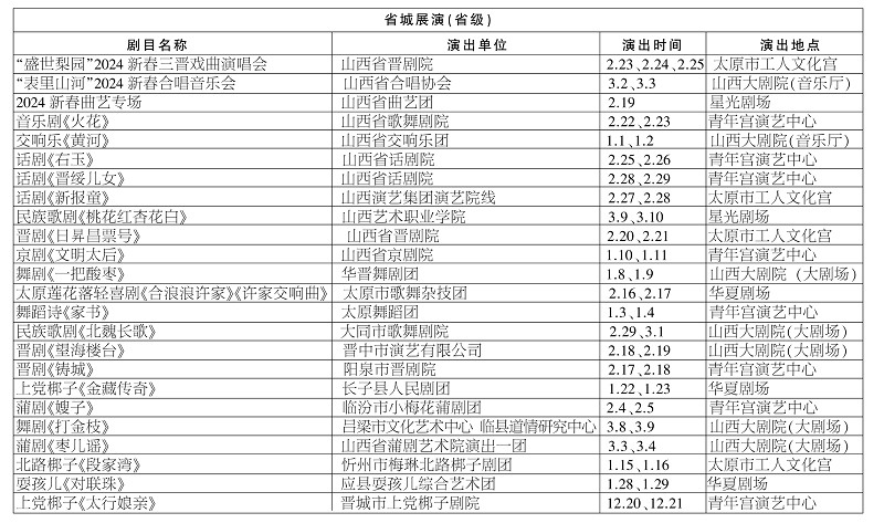 由山西省委宣传部指导、山西省文化和旅游厅主办的2024年“两节”山西省优秀剧目展演将于12月20日在太原市青年宫演艺中心拉开帷幕。41个骨干院团在全省17个剧场演出47台剧目、94场,让老百姓赏好剧、看大戏,共享新春美好文化生活。