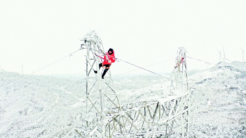 在塔上,他们系紧安全带,调整好身体位置,用一根长木棍有节奏地敲打着导线,一点点清除线路覆冰。大风袭来,他们抱紧铁塔,紧闭双眼,屏住呼吸,待风过后再继续作业。遇到大风长时间不停,为确保人身安全,只能先退回地面。