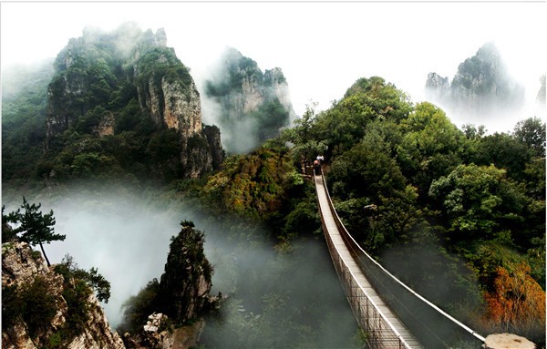 玉柱峰又名“云峰”“灵峰”,海拔1809.3米,壁立千仞,险要神奇,四面如削,拔地通天,似一根直刺苍穹云表的擎天柱石,被誉为“天下奇峰”。“巍巍中条玉柱峰,直耸云雾放苍穹,仰为观止空怅望,攀越而上显英雄。”正是对玉柱峰的生动写照。玉柱峰峰顶面积达5亩有余,有仙桥、南天门、观景台、玉皇殿等。烟雾常锁,山松掩映,俨然一个云端仙境。登上玉柱金顶,吸天地之灵气,汲日月之精华,是对游客勇气、毅力、意志、胆识的考验,也让游客领略到“会当凌绝顶,一览众山小”的壮丽美景。