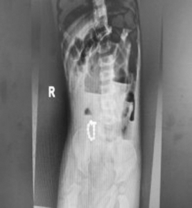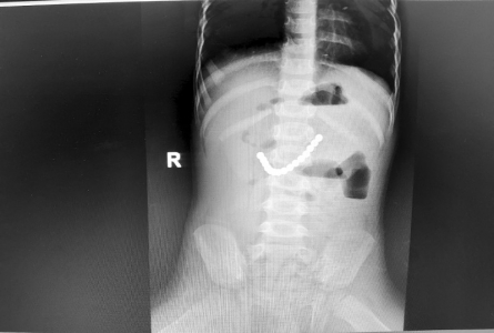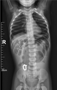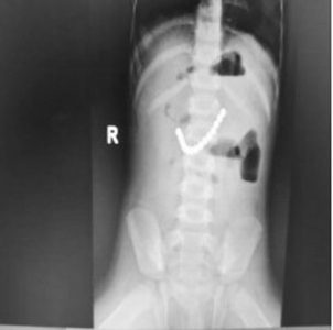 1.患儿:李某某,性别:男,年龄:2岁;简要病史:2岁男孩,因间断腹痛5天,发现消化道异物1天入院。5天前患儿无明显诱因出现腹痛,家长未予特殊重视,1天前患儿出现呕吐伴便秘,就诊于当地医院,行腹部X线片提示消化道异物(磁力球?),遂急诊就诊于我院,诊断“消化道异物(磁力球?)”收住我科。发病后患儿精神食欲差,予以开塞露后排大便1次,小便正常。既往身体健康,无家族遗传病史,心肺腹查体无异常。初步诊断:消化道异物(磁力球?)接下来,患儿需要做什么检查呢?是继续观察自行排出?还是内镜下取出?又或是剖腹探查取出呢?完善腹部X片 (两次间隔时间6小时)显示:磁力球位置未见明显变化(如下图),拟行手术治疗,手术方式为:剖腹探查术。手术探查示 (如下图):胃大弯处可见有2处直径约0.5cm穿孔 (穿孔内取出磁力球5颗),距屈氏韧带约40cm肠管近系膜侧可见2处直径约0.5cm穿孔 (穿孔内取出磁力球10颗),抗菌薇乔全层间断缝合一层胃大弯及小肠肠管穿孔,间断浆肌层加固一层;查无漏气漏液现象,吻合口直径通过顺畅。术毕。术后治疗:予以抗感染、肠外营养、过渡饮食对症治疗,患儿恢复顺利,康复出院。2.患儿:贾某某,性别:男,年龄:1岁10个月;简要病史:1岁10个月男孩,因精神反应欠佳伴烦躁哭闹4天入院。患儿于入院近4天精神反应欠佳,烦躁、哭闹,手捂腹部,呕吐2次,就诊于卫生所予以腹部外敷药物治疗,效果欠佳,后就诊于妇幼保健院,行腹部X片检查,提示消化道异物,自发病以来精神可,食欲欠佳,大便1次,小便量少。既往身体健康,无家族遗传病史,心肺腹查体无异常。初步诊断:消化道异物(磁力球?)完善腹部X片(两次间隔时间6小时)显示:磁力球位置未见明显变化(如下图),拟行手术治疗,手术方式为:剖腹探查术。手术探查示(如下图):距屈氏韧带约30cm小肠有2处直径约0.5cm穿孔(穿孔内取出磁力球1颗、螺丝1颗),距肛门口20cm处乙状结肠近系膜侧可见2处直径约0.5cm穿孔 (穿孔内取出磁力球9颗),据回盲部40cm处小肠系膜可见2处直径约0.5cm穿孔。术后治疗:予以抗感染、肠外营养、过渡饮食对症治疗,患儿恢复顺利,康复出院。