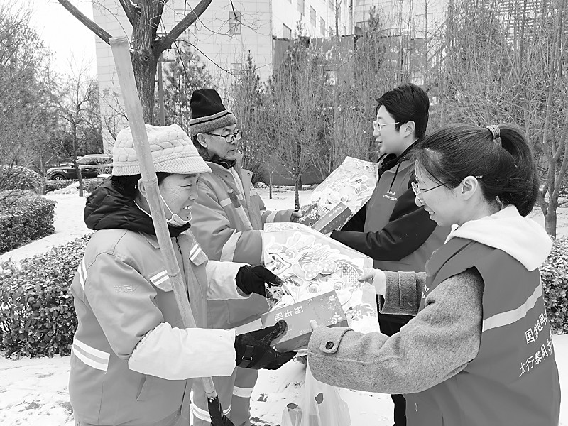 新春将至,岁寒情深。2月1日,国网山西送变电公司太行黎明共产党员服务队走上街头,以志愿服务的方式开展新时代文明实践活动,为在单位驻地路段工作的环卫工人送上春联、福字、窗花、贴画等年俗饰品及洗衣粉、护手霜等生活用品,以实际行动表达对“城市美容师”的关怀与敬意,并为他们送上龙年新春的祝福。