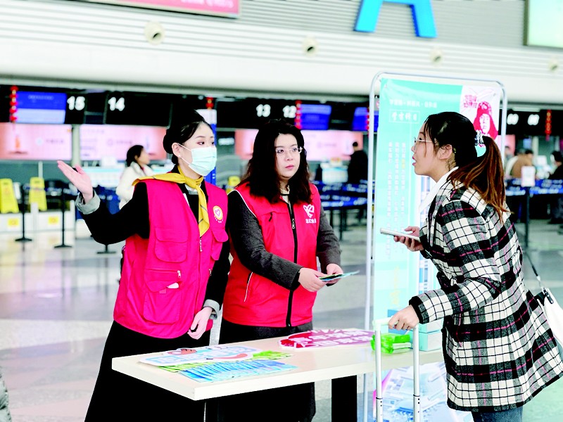 宣誓结束后,志愿者们以饱满的热情,在候机楼出发层、到达层、安检口、值机岛、停车场等处,向旅客介绍乘机注意事项、科普安检常识、危险品运输及净空保护等内容,免费提供消毒纸巾、口罩等物品。同时,针对太原机场停车场地铁施工围挡带来的交通不便,指引机场巴士位置、引导疏通社会车辆、分发山西旅游宣传页,美化空港停车场环境,让广大旅客感受人文山西、锦绣太原。