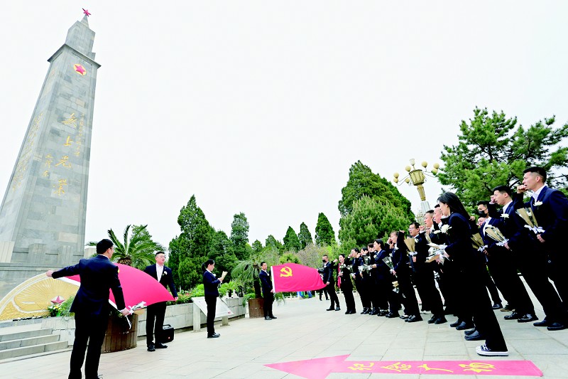 在烈士纪念塔前,随着 《献花曲》奏响,青年代表敬献花篮,全体人员行鞠躬礼后,重温入团、入党誓词。