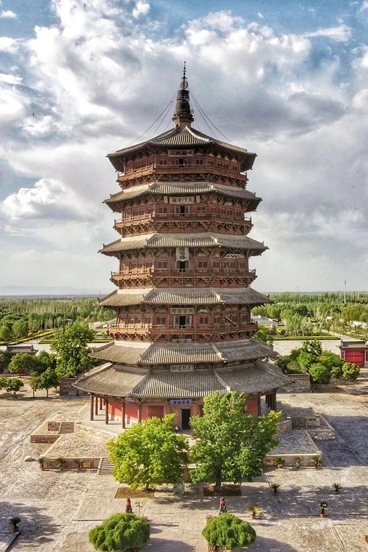 木塔主体使用的材料为华北落叶松,斗拱使用榆木。木料用量多达上万立方米。整个建筑由塔基、塔身、塔刹3个部分组成,塔基又分为上下两层,下层为正方形,上层为八角形。塔身呈现八角形,外观五层六檐,实为明五暗四九层塔。塔刹由基座、仰莲、相轮、圆光、仰目、宝盖、宝珠组成,制作巧妙,与塔身融为一体。