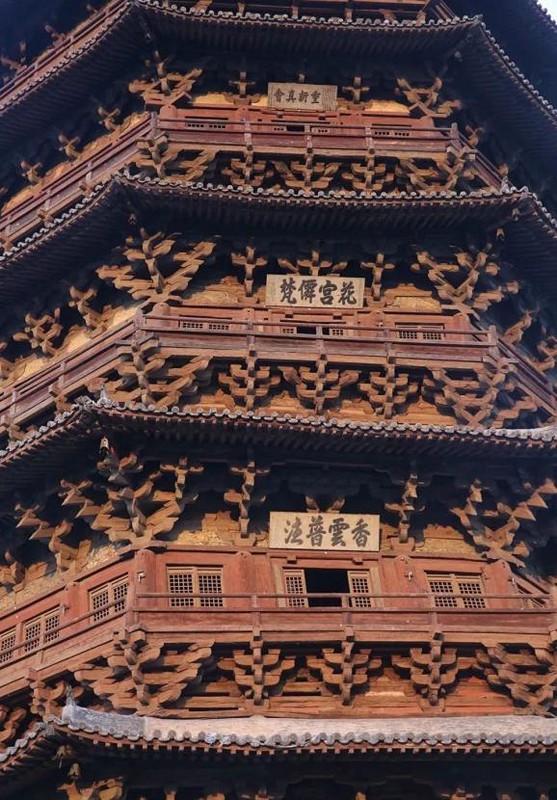 全塔上下有59种不同形式、成百上千朵斗拱,犹如朵朵盛开的莲花装点于塔身各处,种类之多国内罕见,有“斗拱博物馆”之称。古籍上誉其为“远看擎天柱,近似百尺莲”。