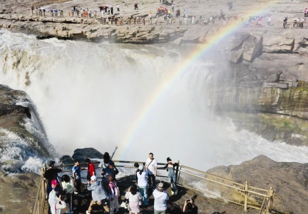 当日,受降雨影响,黄河壶口瀑布水量增大,河水翻滚而下,飞溅起的水雾在阳光的照射下,形成“彩桥通天”景观。