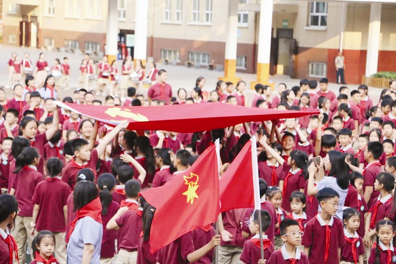 升国旗、奏唱国歌、出队旗、奏唱队歌、佩戴红领巾、“红色传递”、宣誓、呼号……“六一”期间,全省各级少先队组织集中开展了“红领巾爱祖国”新队员入队仪式,10万余名一年级小学生通过神圣庄严的入队仪式,完成人生中第一次身份转换,迈出“人生三部曲”中光荣的第一步。