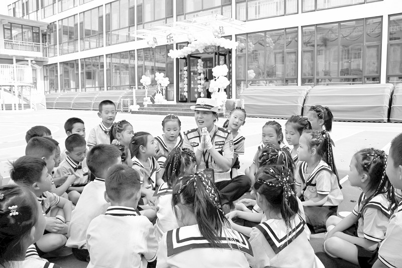 民警在学校安全员的配合下,结合幼儿年龄特征,以看图学安全、游戏互动、寓教于乐等方式,带领孩子们认知交通标志标线,学习交通指挥手势,告诉他们如何安全过马路,引导孩子们要自觉遵守交通法规,从小抵制不文明交通行为,远离交通危险行为,提高了孩子们交通安全防护意识。