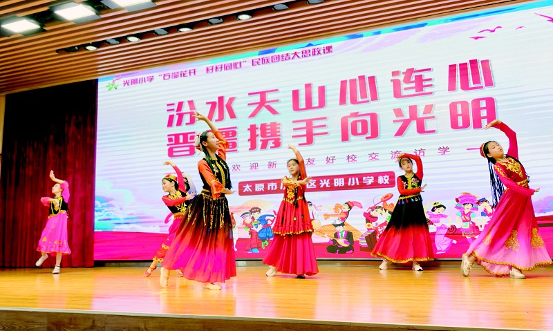 光明小学精心策划的 “石榴花开,籽籽同心”民族团结主题思政课暨展演将活动推向了高潮。晋疆两地的学生同诉心声、共展才艺,诠释了中华文化的多元一体之美。互赠文化信物环节成为 “晋疆儿女心手相牵”的深情写照,充分彰显了“中华民族一家亲”。