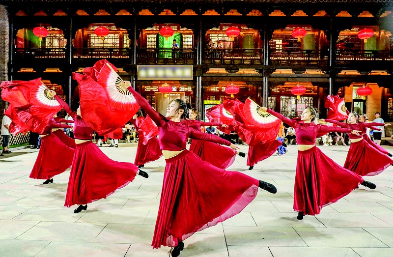 白日里,鼓韵声声。“中国龙”节目鼓声一响,古城里的金裹谷广场瞬间沸腾起来,地龙在地上“花式翻滚”,场面宏大。还有“科举再现”情景剧,从排队入场、低头答卷,到最后“金榜题名”,一套流程走下来,比看书本还有趣。“西游记天团闹古城”节目引来游客争相与“师徒”合影。