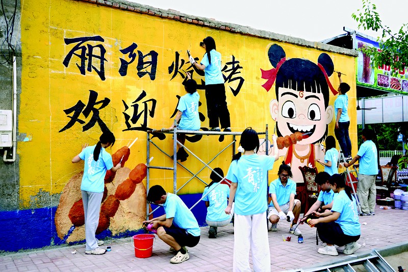 在阜康市城关镇丽阳村,队员们执起画笔,精心创作了3幅主题墙绘:“哪吒·疆味”墙绘中,哪吒手持新疆羊肉串与馕饼的创意形象,引得村民频频驻足,传统神话与边疆风味的巧妙碰撞,正是文化交融的生动写照;“绿水青山·家园”墙绘,则以写实笔触将天山的广袤草原与三晋太行雄风同框呈现,无声诉说着两地生态共护、发展同心的美好愿景;“红石榴·晋疆情”主题墙绘,则以鲜明的意象,将“各族人民要像石榴籽一样紧紧抱在一起”的理念直观呈现。这些墙绘作品已然成为丽阳村开展民族团结教育的鲜活教材,持续传递着守望相助、美美与共的深情厚谊。