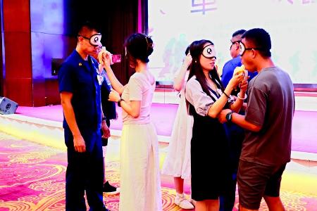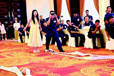 现场的“男女战服穿速赛”将活动推向了高潮。男士比拼消防服穿戴速度与规范度后,女士接力挑战,消防员则在一旁暖心提示穿戴技巧。“硬汉支撑·甜心叠杯大挑战”中,男士以俯卧撑姿态做支撑,女士在其背上叠放纸杯,最终凭数量决胜负,活动中既有角逐,又有互相鼓励,现场温情满满。“蒙眼赴约,喂蕉识缘”环节趣味十足。男女嘉宾进行分组后,男士蒙眼转圈后凭直觉寻找搭档,女士则手持香蕉投喂给男士。嘉宾们在摸索中靠近,偶尔的“错认”引发现场阵阵欢笑声。