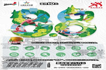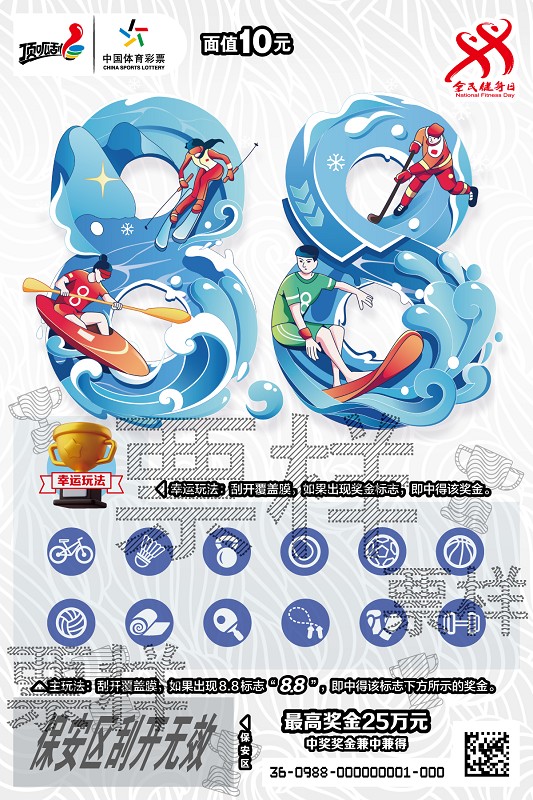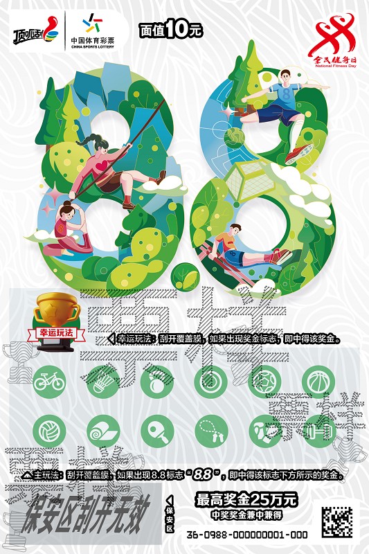 “全民健身 我来啦Ⅲ”即开票面值10元,游戏规则简单易懂,却又充满了乐趣与惊喜,精心设置了主玩法和幸运玩法两种游戏玩法,主玩法为:刮开覆盖膜,如果出现8.8标志“8.8”,即中得该标志下方所示的奖金。幸运玩法为:刮开覆盖膜,如果出现奖金标志,即中得该奖金。中奖奖金兼中兼得。