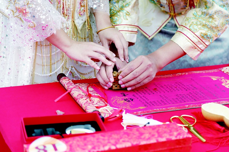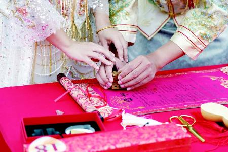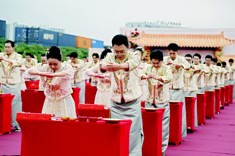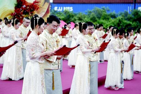 10时09分,良辰吉时至,随着欢快的乐曲声响起,婚礼仪式拉开序幕。50对新人身着金色华服,手执红绸绣球,满怀幸福憧憬步入喜堂。在主持人的引领下,新人们跨火盆、过马鞍,行三拜礼、沃盥礼、同牢礼,饮合卺酒、行结发礼、签署婚书,共同许下“相守一生、白头偕老”的爱情誓言。