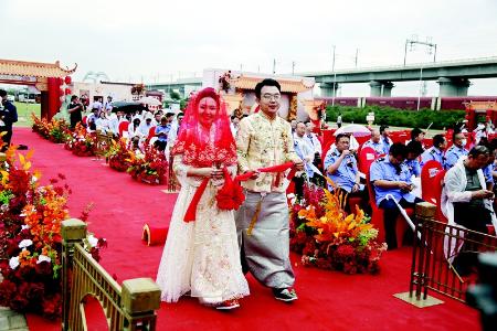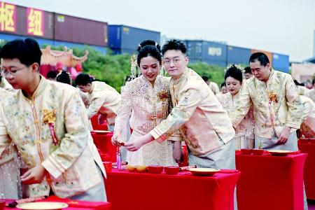 上午9时,山西中鼎物流园区内红灯高挂,处处洋溢着铁路元素和“中式浪漫”的气息,前来参加集体婚礼的亲朋好友、观礼嘉宾漫步文化市集中,体验传统文化,见证美好良缘。