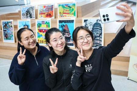 在太原师范学院内,来自重庆的江美琪同学举起手机跟小伙伴们在山西古建美术作品展前合影留念。当日,以“古建筑·新青年”为主题的2025年山西青少年古建筑文化展在校园内开展,吸引众多全国各地的学子参观。 本报记者 胡远嘉 摄04版
