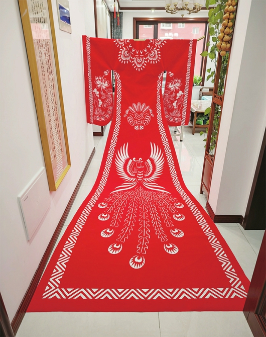 这份创新的背后,是毫米间的极致匠心。凤凰头饰的翅膀与凤尾比例历经两次调整,只为呈现轻盈灵动的视觉效果;剪纸服饰既要保证全身图案主题统一,又要兼顾穿戴牢固度,在保留立体感的同时要经得起日常触碰。“第一次看到平面剪纸‘立’在衣料上,随着动作轻轻晃动时,我觉得所有努力都值的。”回忆起模特首次试穿时的场景,路冬梅眼中满是欣慰。