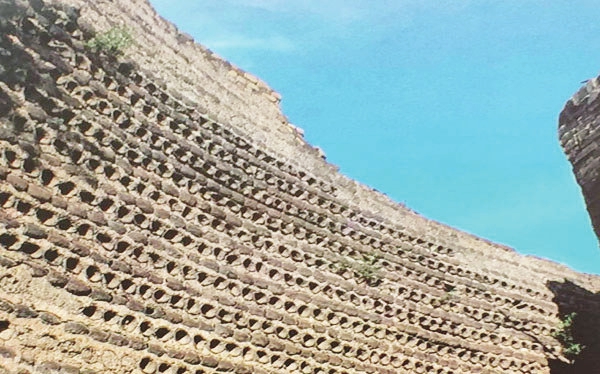 砥洎城的城墙极富特色,号称“铜墙铁壁”。城墙外侧包以青砖,与其他城墙如出一辙,内墙的建筑材料主要来源于当地冶铁后废弃的坩锅,从城墙内侧可以清晰看到坩锅与石条混彻的特殊结构,那密密麻麻、整整齐齐排列的坩锅,让人切身感受了“蜂窝城墙”。城墙高12米左右,西侧临水的部分高达20米,临水城墙随地势呈梯状分为两层,两层之间有坡道连通。