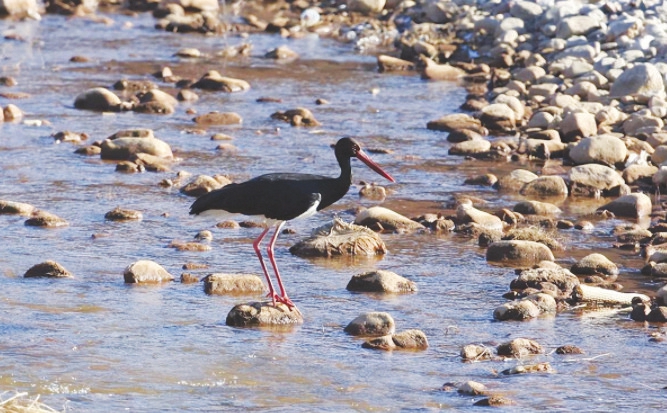 素有“鸟中大熊猫”之称的黑鹳,是山西省四大旗舰物种之一,也是国家一级保护野生动物。近年来,随着野生动物保护工作的加强,芦芽山保护区境内的黑鹳种群数量明显增多。从近年来的冬季水鸟调查监测结果来看,黑鹳成了留鸟,一年四季都有发现,且活动范围不断向周围扩展,河流附近、村庄上空经常可见黑鹳捕食、停息、飞翔。黑鹳的栖息环境主要在山体岩石、清浅水域或河流湿地,由于主要以捕食鲫鱼、泥鳅、青蛙为主,被当地人称为“捞鱼鹳”。
