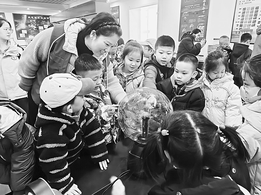 活动中,孩子们来到室外观测场,被一门绿色的人工增雨高炮所吸引。阳泉市气象局工作人员指着炮管、轮架等部件,用“给云朵‘打针’就能下雨”的通俗比喻,生动讲解人工影响天气的原理。针对冬季寒潮、降雪等常见天气,工作人员结合观测场设备,演示如何监测天气数据。大家还走进气象展示厅,了解本地地形与冬季气候的关联性,在互动小游戏中轻松理解气候数据。