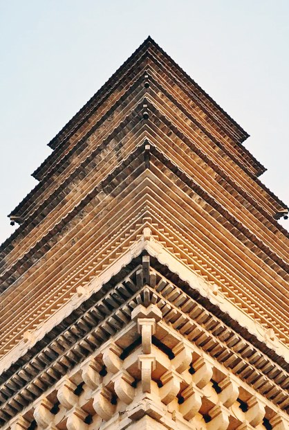 东塔高约40米,塔中为佛龛,以上为实心塔柱。塔体外每层西面均设有一个隐形拱门和两个直棂窗,与西塔遥遥相望。西塔为方形九级,密檐楼阁式。塔券门南侧,可至二层东面拱券门中,拱券门内通塔心,可直达塔顶。